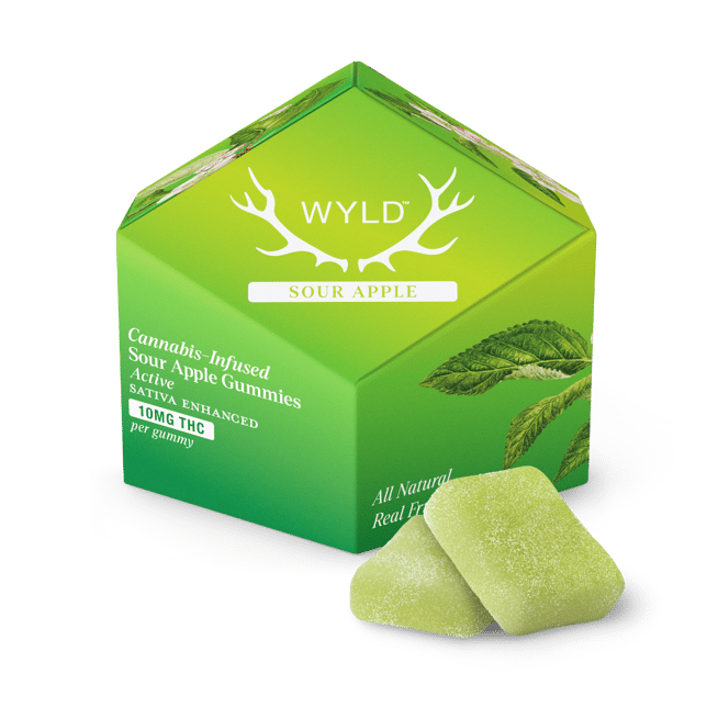 Wyld's mouth-watering Sour Apple gummies are infused with THC and Sativa terpenes. Made with real fruit + great for enhancing moments.
